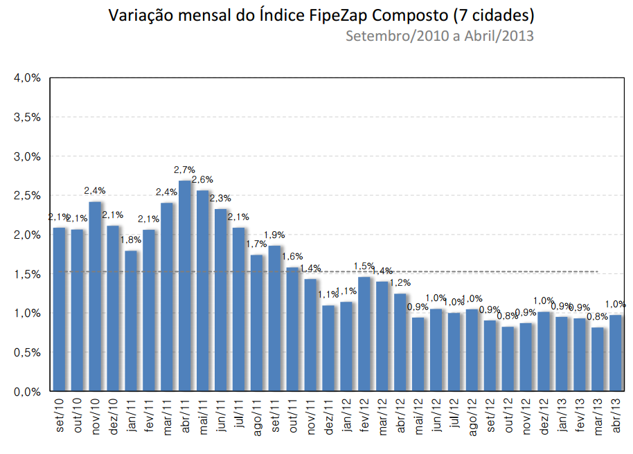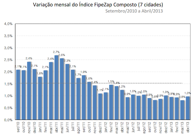 A Fundação Instituto de Pesquisas Econômicas - FIPE - da USP - Universidade de São Paulo, divulgou o índice FIPE-ZAP relativo a abril de 2013, o qual apresentou variação positiva de 1,1% no preço anunciado do m2 - número que é 0,2 pontos percentual maior do que a registrada