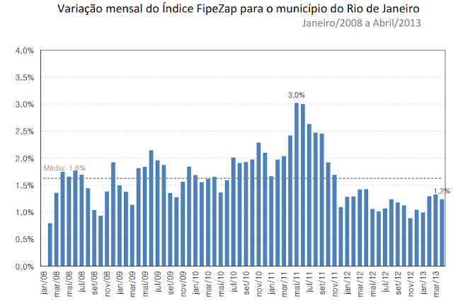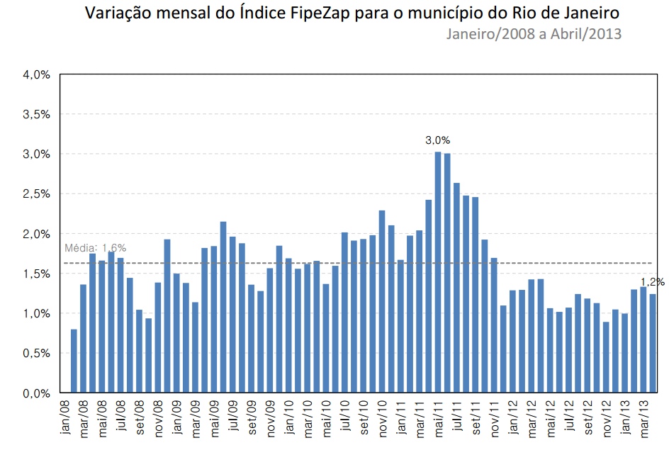 O Rio de Janeiro continua a apresentar interessantes valorizações em 2013, com variação de 1.2% em abril. A cidade será palco de importantes eventos esportivos nos próximos anos e, por isso, recebe grandes investimentos, o que explica a elevada valorização pela qual tem passado.