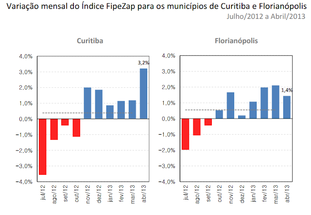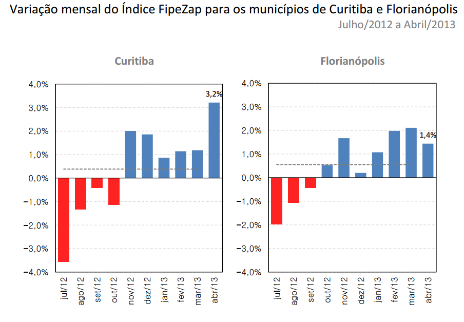 Essas duas cidades da região Sul estão experimentando valorizações expressivas de seus respectivos mercados imobiliários em 2013, com Curitiba tendo se valorizado nada menos que 3.2% em abril de 2013. Florianópolis, com 1.4%, também se apresenta como uma das maiores variações em âmbito nacional.